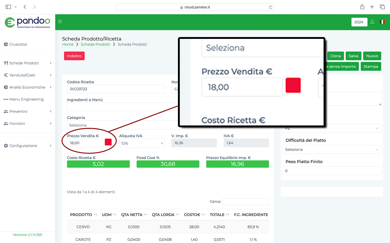 PANDOO ti suggerisce il prezzo di vendita di ogni singolo piatto